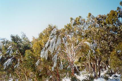 Trees with leaves and snow on them. Crazy Ozzies!They are called “snow gums” BTW.